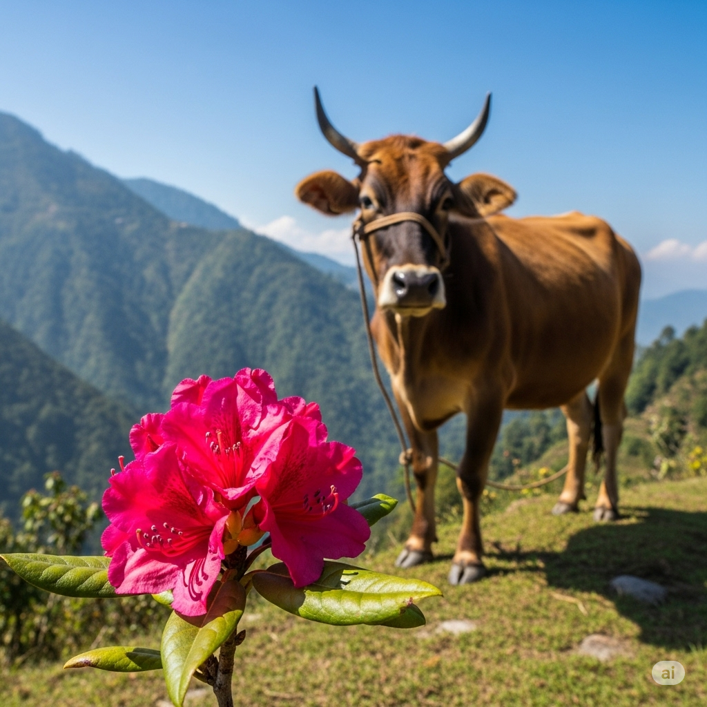 The national animal is the cow, and the flower is the rhododendron.