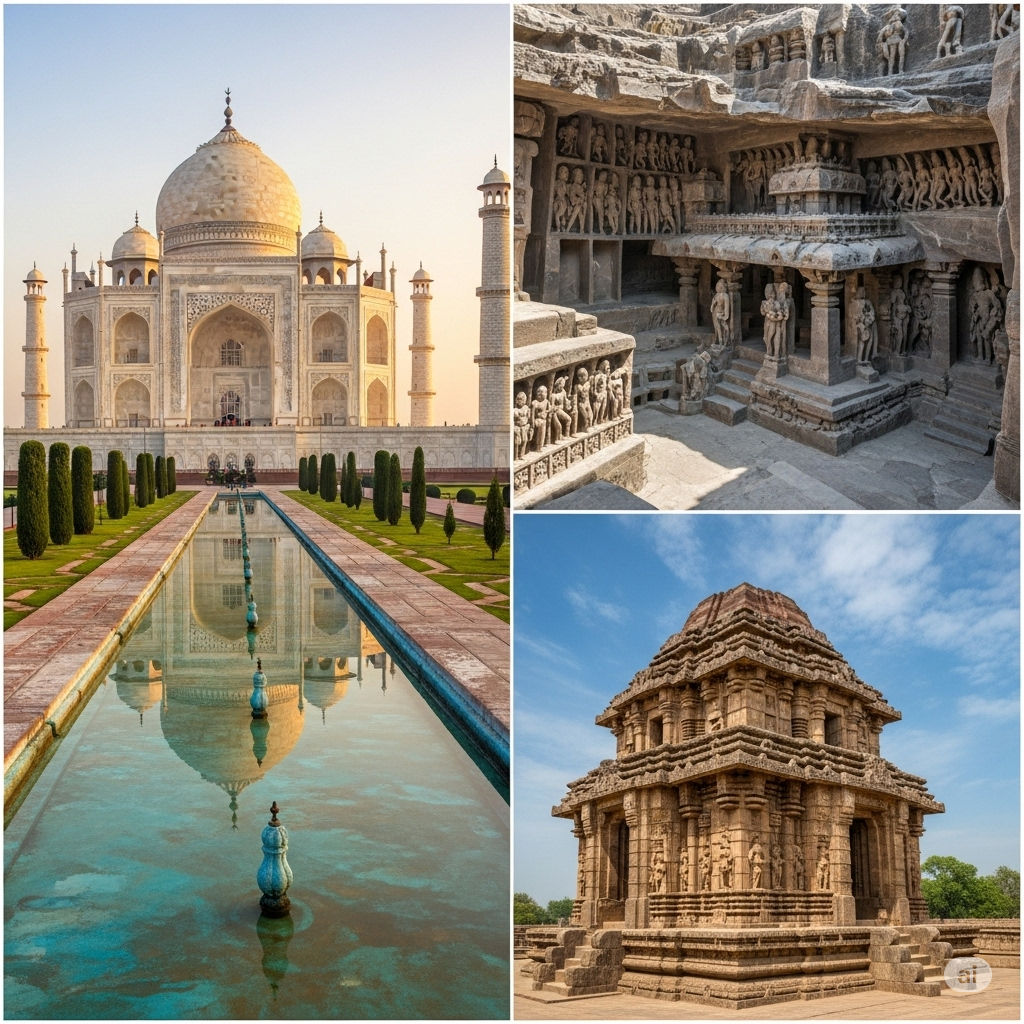 The Taj Mahal, Ajanta Caves, and the Sun Temple at Konark are three UNESCO World Heritage sites in India.