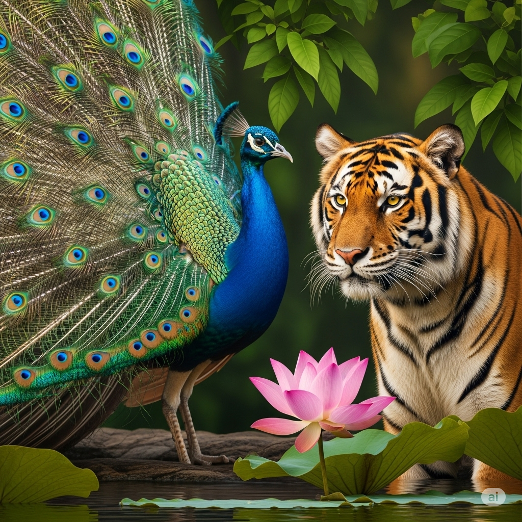 The national bird of India is the peacock, the national animal is the Bengal tiger, and the national flower is the lotus.